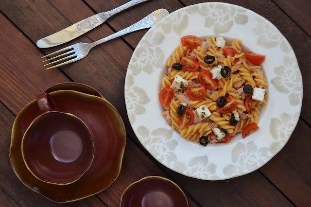 Nada me soa mais prático do que uma salada de massa, que se pode comer fria ou quente, a que podemos juntar mil e um ingredientes, aproveitar sobras no frigorífico, ou aqueles legumes de época que imploram por serem consumidos... esta é uma das minhas versões favoritas (confesso que apenas recentemente experimentei massa com atum, nesta versão, e fiquei fã!), com atum ao natural, tomates frescos, queijo cremoso de sabor intenso e aromático, que só a Saloio nos sabe dar... o toque perfeito para a minha marmita!