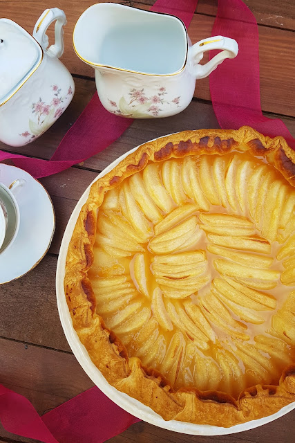 4. Leve a tarte ao forno, pré-aquecido nos 180 ºC durante 20 a 30 minutos, até que a massa folhada fique bem cozinhada e dourada. Sirva morna, com uma bola de gelado de baunilha, ou à temperatura ambiente.