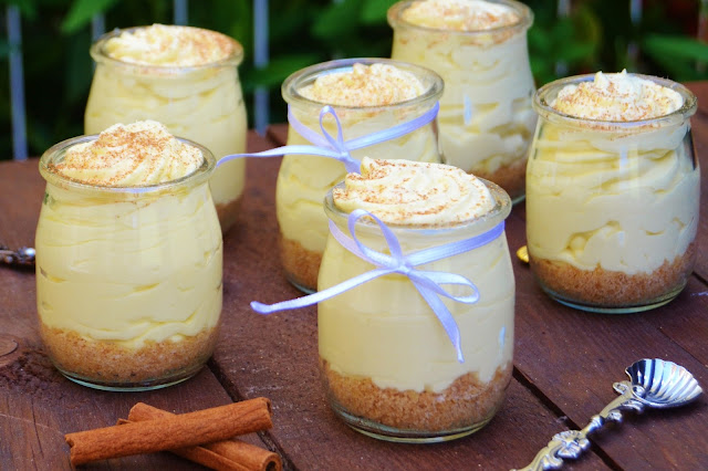4. Distribua o creme pelas taças individuais. Cubra as taças com película aderente e leve os cheesecakes ao frigorífico durante, no mínimo 3 horas. Antes de servir polvilhe com com canela e pó dourado a gosto.