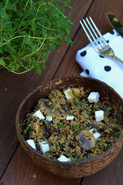3. Envolva a quinoa, os cogumelos salteados e o queijo de cabra. Polvilhe com tomilho e sirva de imediato. Esta salada pode ser consumida quente ou fria.