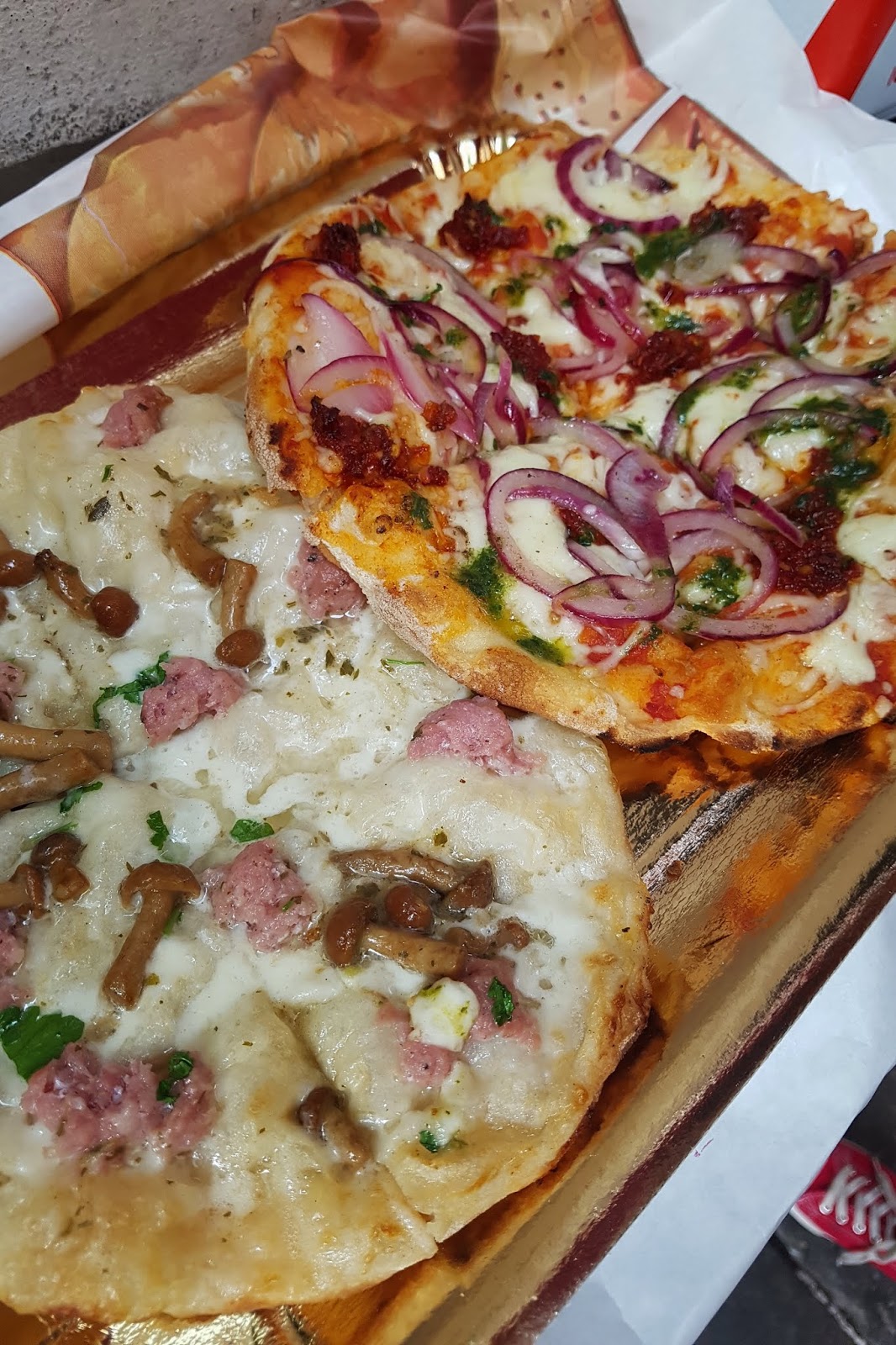 Optámos por um pizza de cogumelos e azeite de trufa (pizza da esquerda, suave e maravilhosa) e uma pizza de chouriço picante, cebola roxa e molho pesto (pizza da direita, super apetitosa e muito picante!), ambas incríveis, de massa pizza, suculenta e estaladiça... a melhor pizza que já comi na vida!