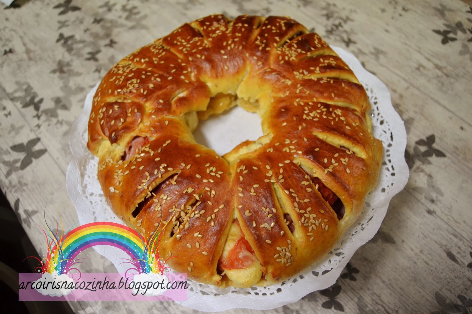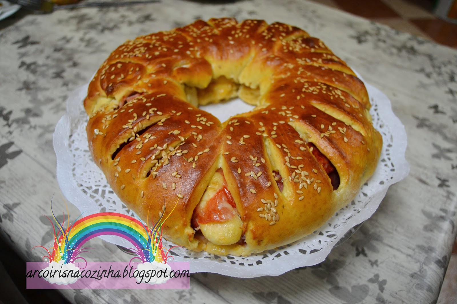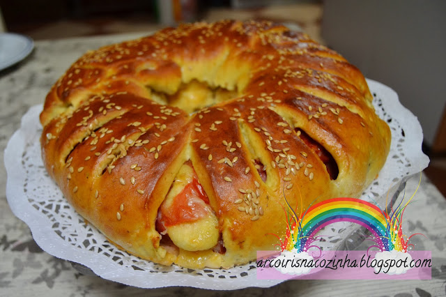 5. Enrole com cuidado a massa pelo lado mais comprido do rectângulo e aconchegue bem. Una as duas pontas, com a ajuda de um ponto de água, formando uma coroa e coloque sobre o tabuleiro.