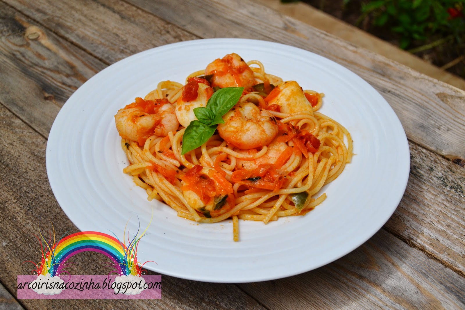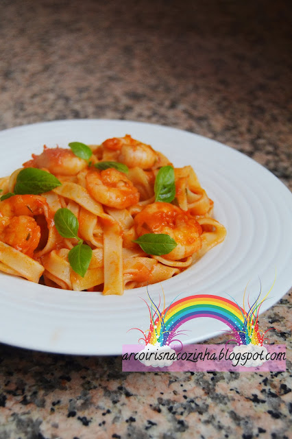 No novo livro do Jamie Oliver, Poupe com Jamie, existem várias receitas que me ficaram debaixo de olho... e as receitas de massas à base de tomate chamavam por mim impiedosamente... e pronto, daí nasceu esta adaptação à qual adicionei uns camarões maravilhosos, cheios de sabor! Estava com receio que o molho retira-se o sabor dos camarões, mas realmente é uma das vantagens em apostar em produtos de qualidade, como os produtos Pescanova, porque mantiveram todo o seu sabor, que foi realçado pelo molho de tomate e pimento.