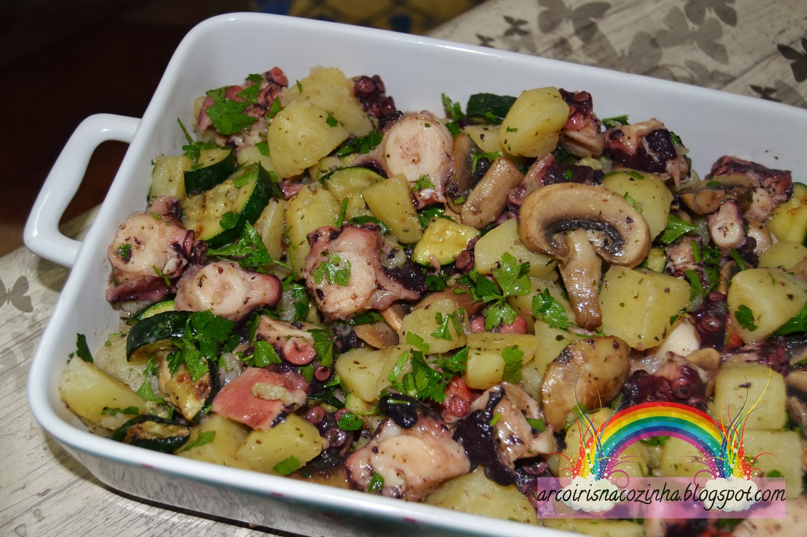 5. Quando as batatas estiverem quase prontas adicione o polvo à assadeira e regue-o com o azeite aromatizado.