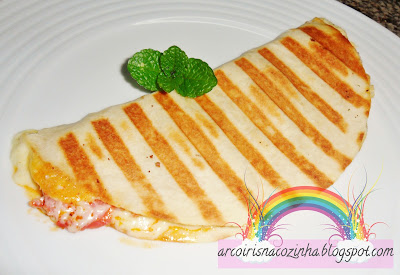 1. Numa metade de cada tortilha coloque 2 fatias de bacon, chouriço e 2 fatias de queijo flamengo.